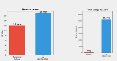 These plots compare the biological neuronal system against an AI model trained on the same Asteroid Dodger task under broadly similar task constraints. The comparison highlights both the time required to acquire effective control and the energetic overhead associated with learning.