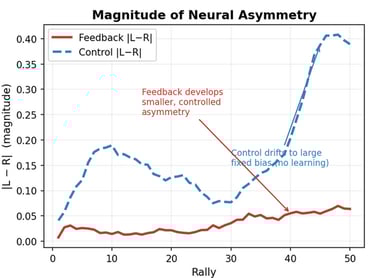 The asymmetry metric shown above corresponds to the decoded left-right spike-count difference that drove continuous ship displacement in the Asteroid Dodger task. Because movement was computed directly from this differential motor signal, stable asymmetry is a proxy for the emergence of task-relevant neural control. In the feedback-trained condition, this signal converged toward a persistent, interpretable directional bias, whereas the no-feedback control exhibited drift without comparable stabilization. Given that both conditions shared the same sensory structure, the separation between the two traces suggests that closed-loop reinforcement shaped the neural dynamics into a more behaviorally useful control signal.